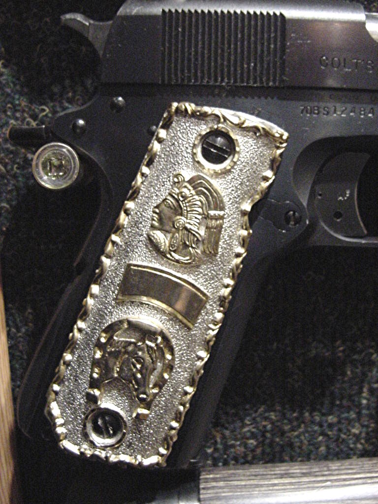 Since Texas Rangers began carrying Colt 1911 and Commander grips they have favored fancy ones. Originally they were obtained in Mexico from friends in the Mexican military or law enforcement. Now these sterling silver and gold grips command several thousand dollars and are very collectable. Chisholm’s Trail had gone to great lengths to bring some of the best designs back to life.