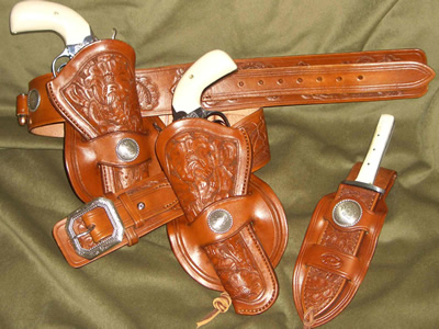 We can produce a plain working cowboy rig on up to the finest hand tooled works of art including sterling silver conchos and buckles |