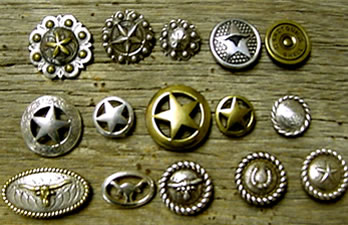 ![]() Just a few of the Concho choices to really set off your gun belt or holster. TO UPGRADE TO CONCHOS ADD $10.00 each Many of the above conchos are being discontinued by the supplier. PLEASE visit our BUCKLE page to see new conchos we are producing. |