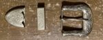 Oval 1 1/4″ conchos with scalloped edges and engraving with small oval in the center. Conchos are held on to the hat band with lacing at top and bottom. Nickel plated ~ $29.95 each. In solid sterling silver ~ $49.95 each.